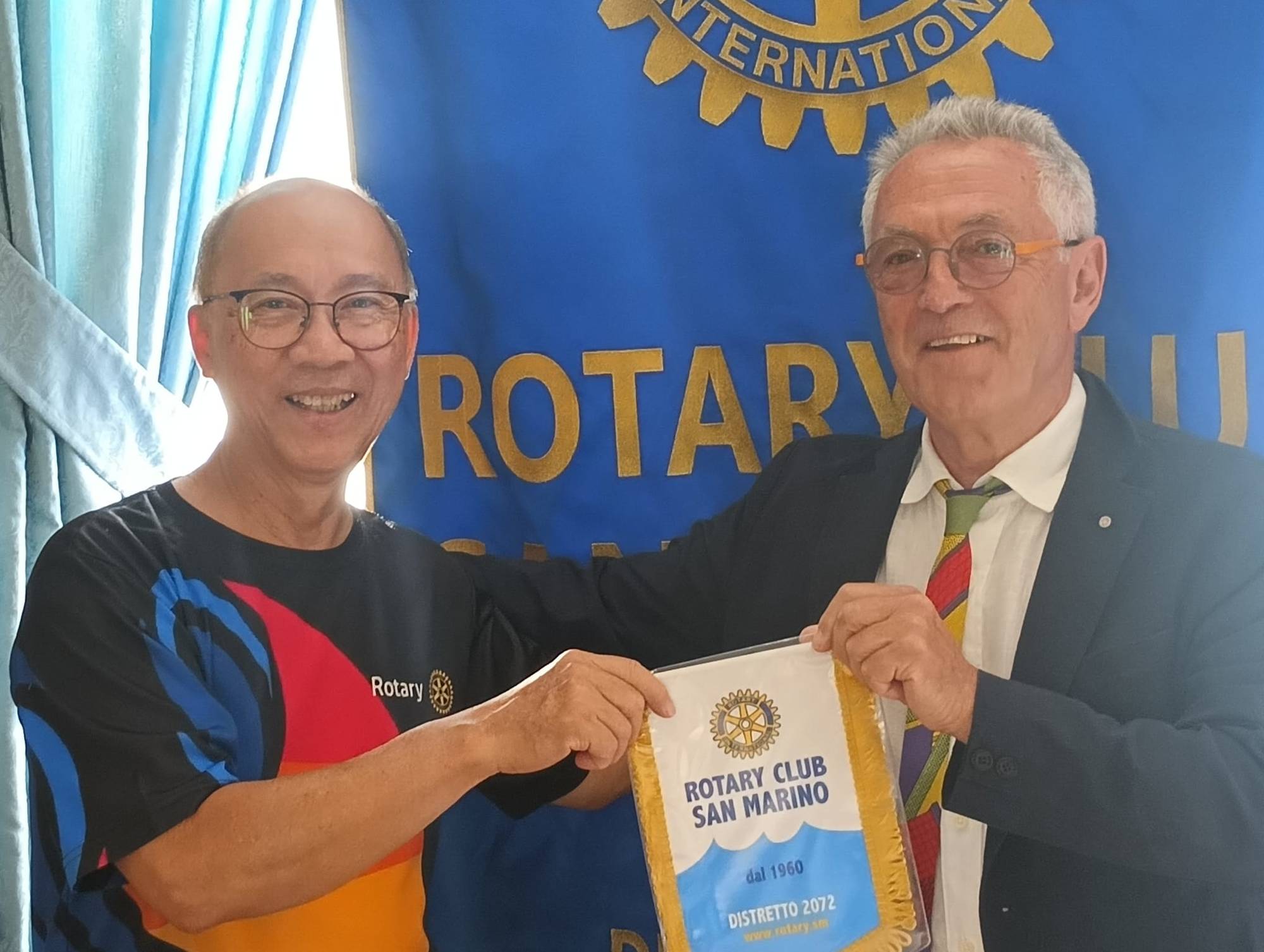 Il suo look sportivo con maglietta coloratissima personalizzata Rotary, portata con orgoglio, ha facilitato la presentazione e la codifica rotariana, dopo una breve e non facile chiaccherata e lo scambio degli indirizzi gli viene consegnato il Gagliardetto ufficiale del Club, immortalando il momento con una foto.